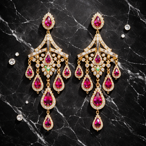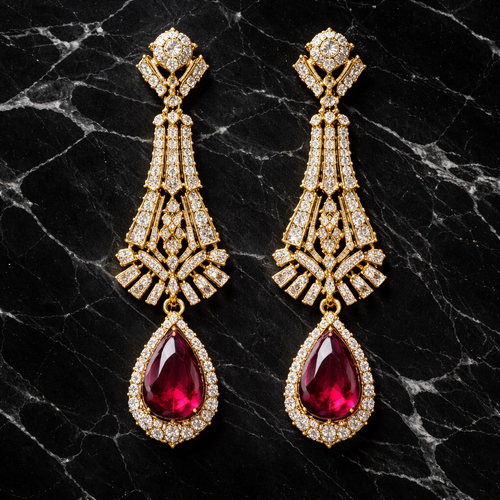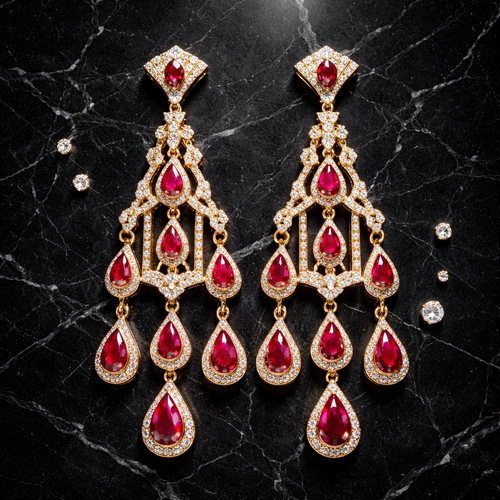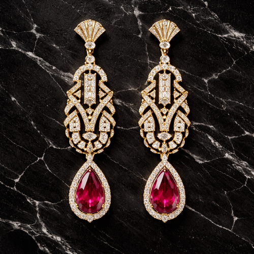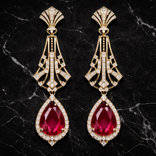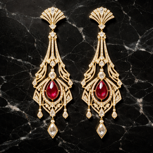 A pair of gold art deco chandelier earrings with ruby teardrop gemstones and diamond accents, laid flat on polished blac...