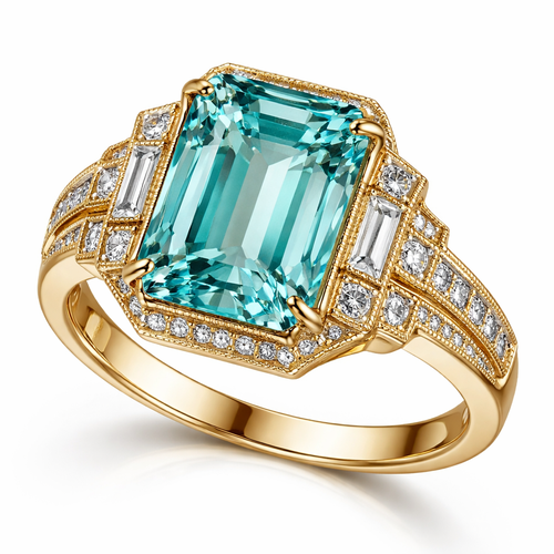 18ct gold ring using coloured gemstone aqua are emerald cut