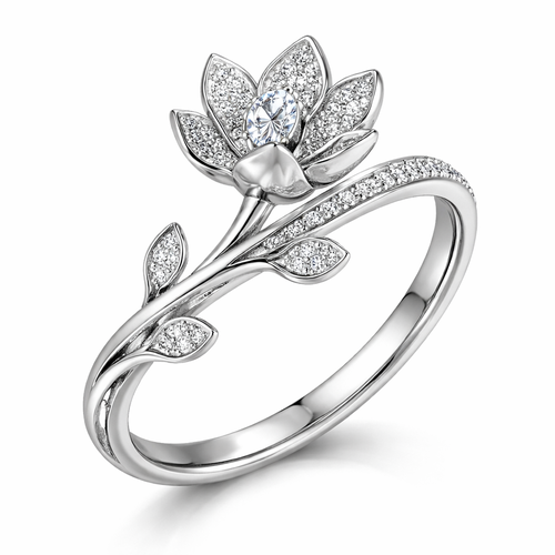 a ring with a silver band that has a stem rapping around with some pettels that are also silver with some small diamonds...