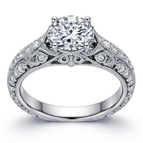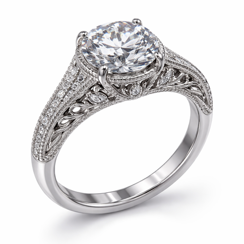 I want a round ring with diamond accents on the band and designs in the bridge