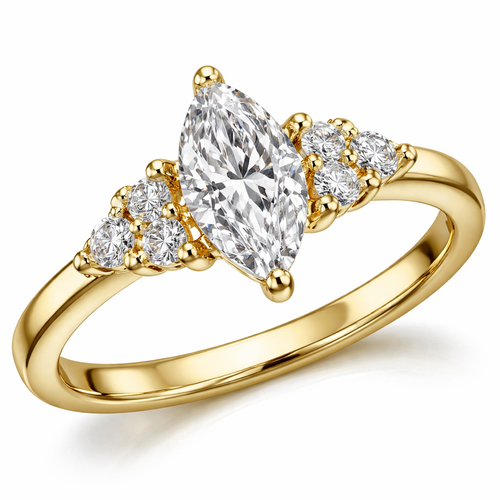 18ct yellow gold trilogy ring centre marquise cut diamond with small round side diamonds