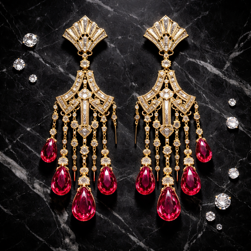 A pair of gold art deco chandelier earrings with cascading ruby teardrop gemstones and small diamond accents, laid symme...