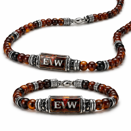 Do not use silver Necklace and bracelet for man only amber stones small size EVW logo on the amber stone red and black a...