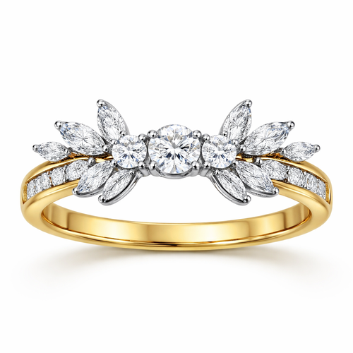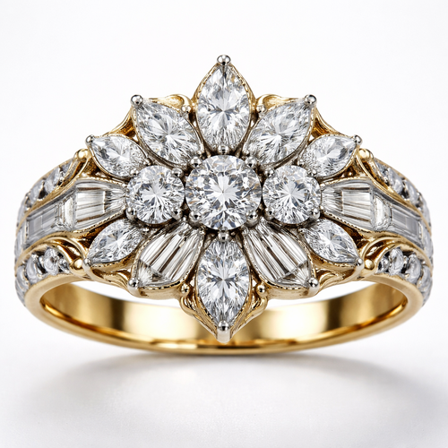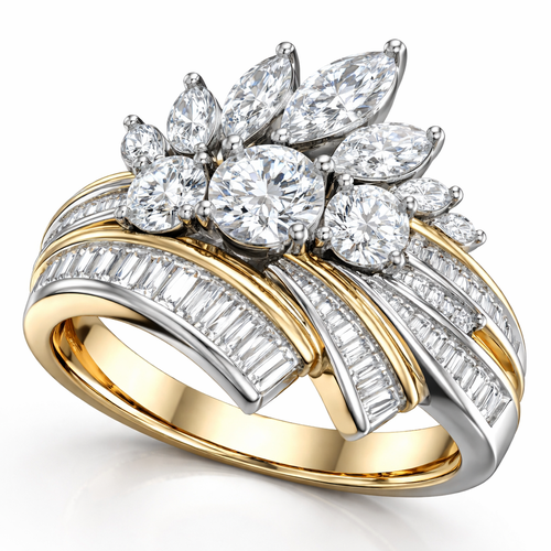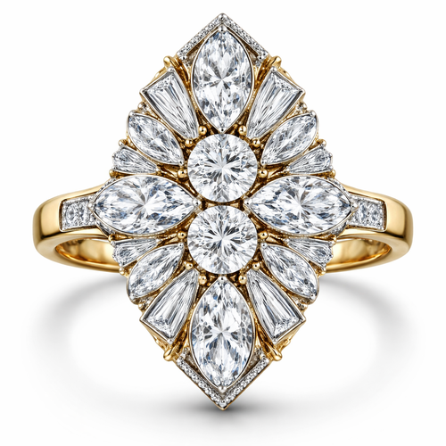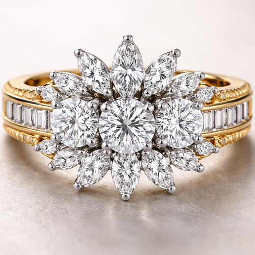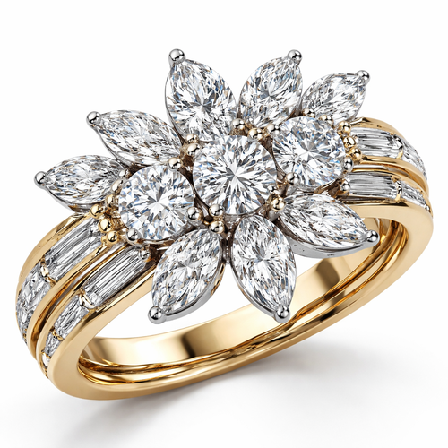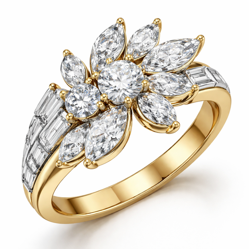 Create a ring with 3 round diamonds the largest being .25 , 7 marquise diamonds with the largest being.6 , several bague...
