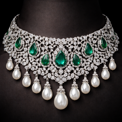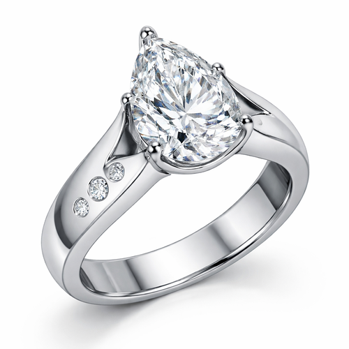 White gold pinched shank with 3 ct pear shape diamond with 5 prong mounting. Then add round bezel set down each side in...