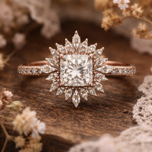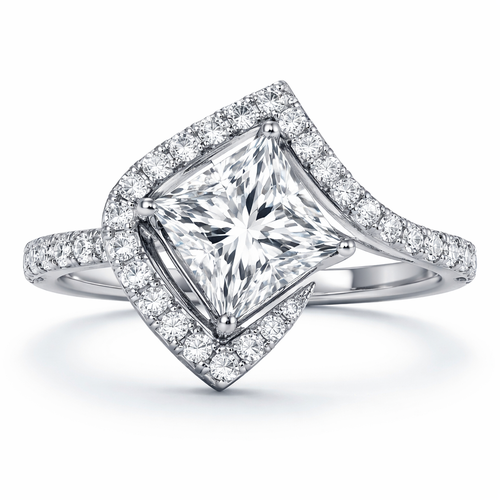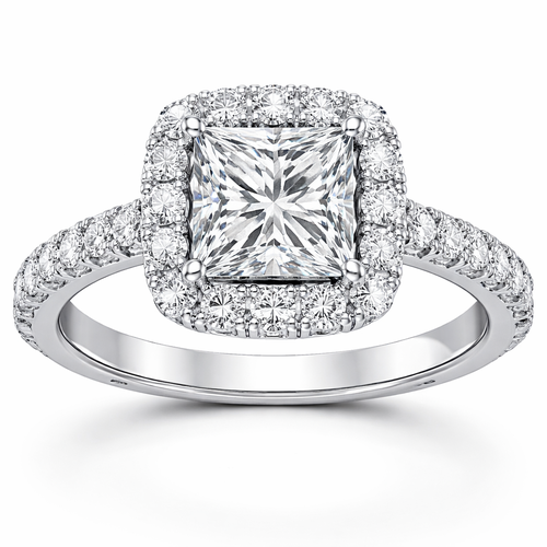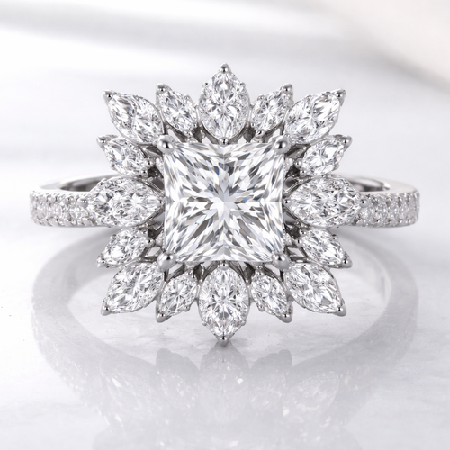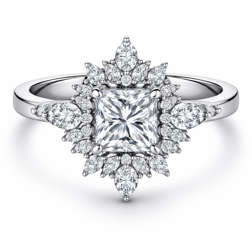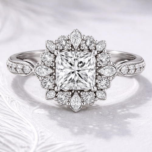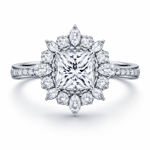 White gold with 1ct princess cut diamond. Halo with marquise diamonds.