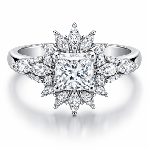 Solid white gold band with 1ct princess cut diamond. Starburst halo with 3 marquise diamonds on either side and the rest...
