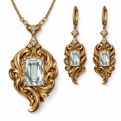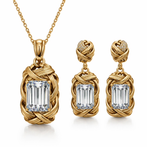 Create pendant and earrings with emerald cut diamonds, with leather design in gold