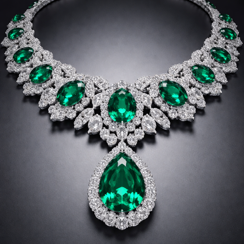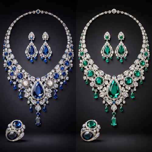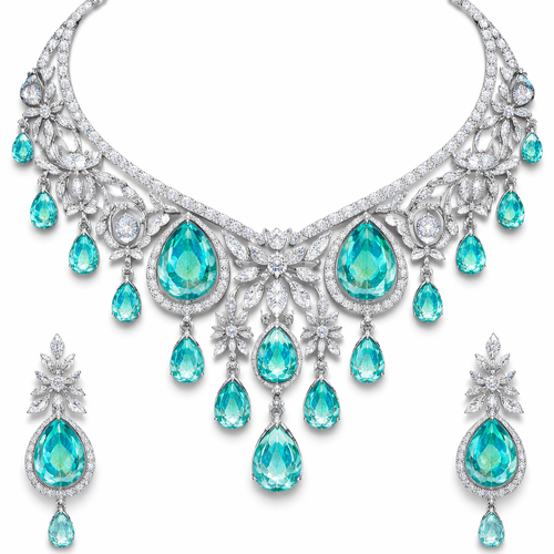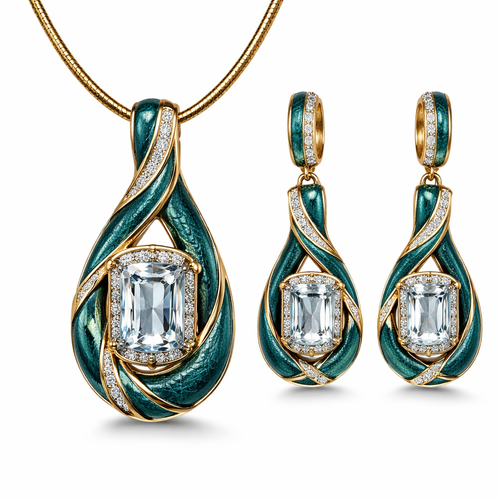 Create pendant and earrings in blue green colors with emerald cut diamonds, with leather design in gold