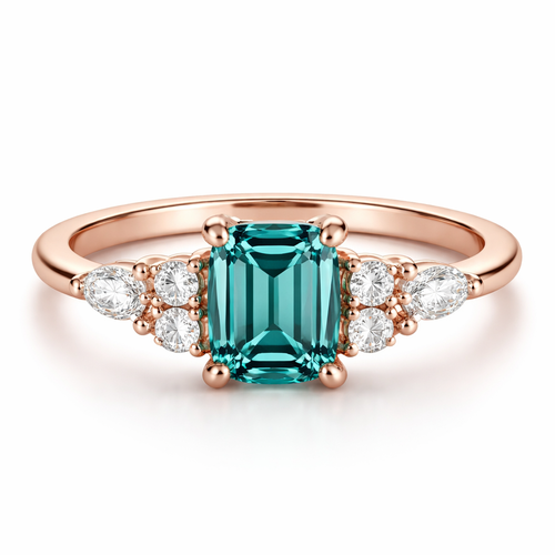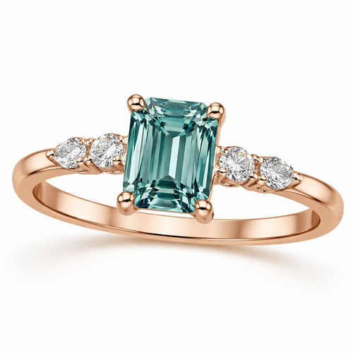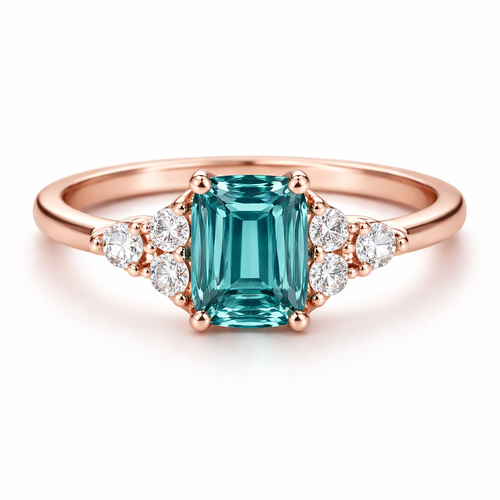 Rose gold ring with a teal moissanite .75 ct emerald cut center stone. To the side of the center stone on each side are ...