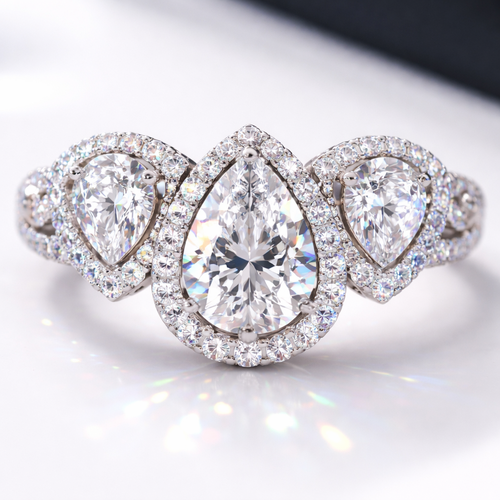 AB micro diamonds encase two smaller up turned tear drop .5 carat diamonds and one down turned 1 carat diamond in the ce...