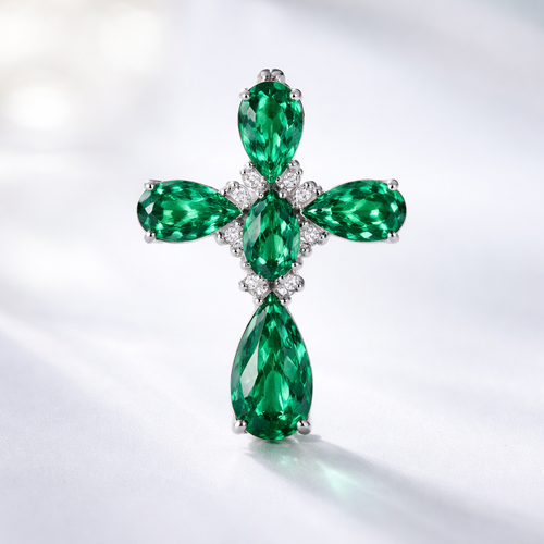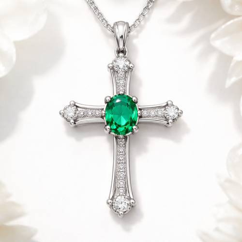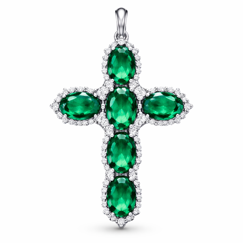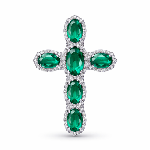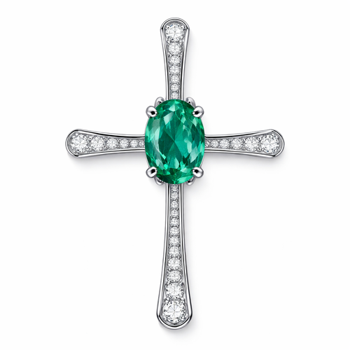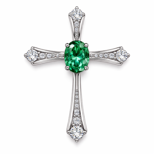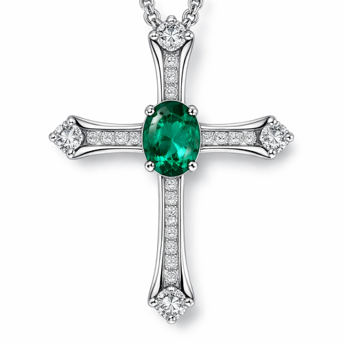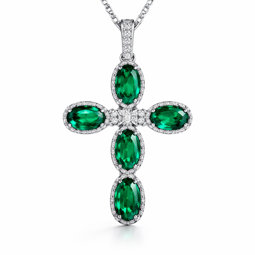 Oval cut emerald, white gold cross, with simple accent diamonds