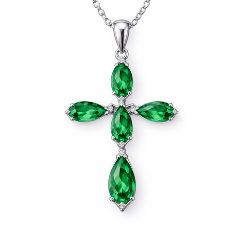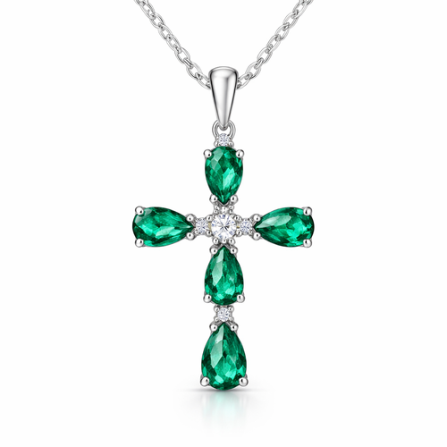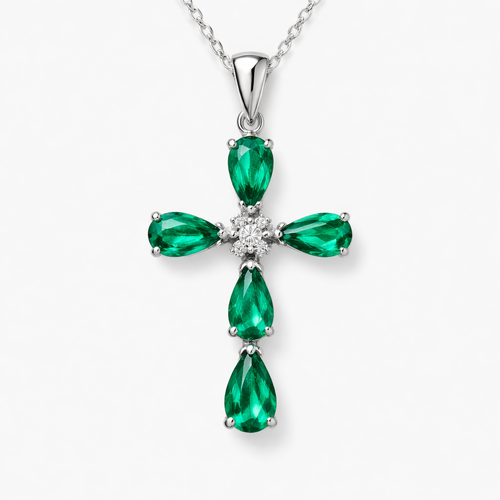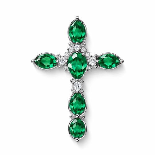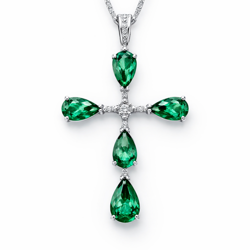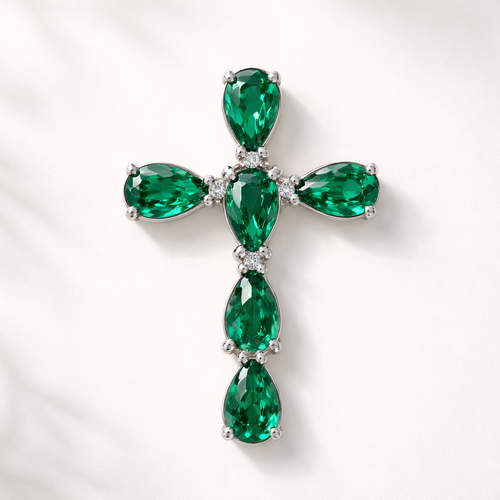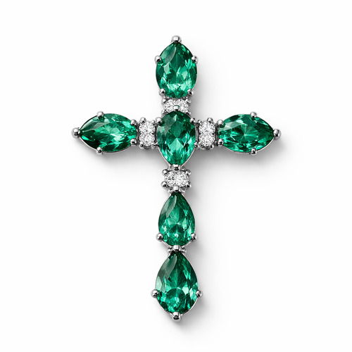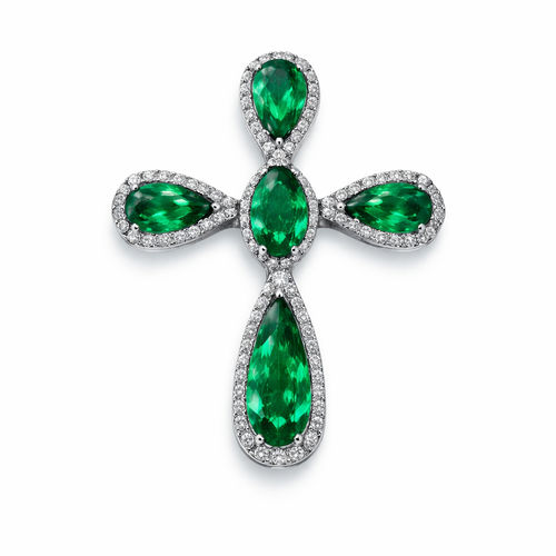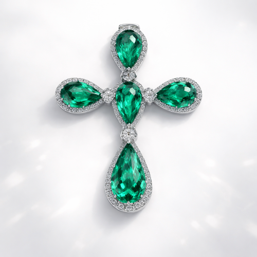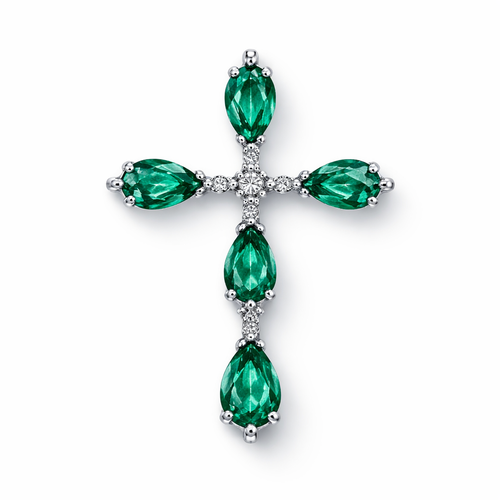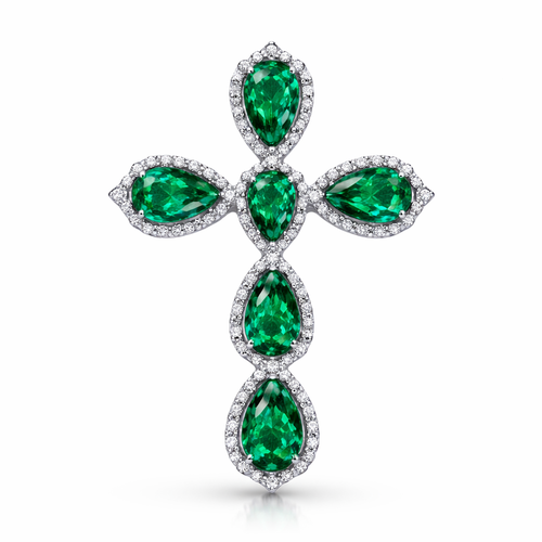 Simple and timeless pear cut emerald white gold cross with minimal diamond accents. Light metal work.