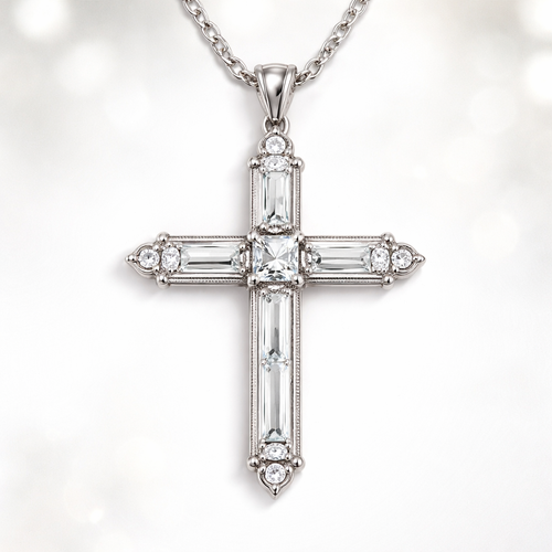 Oval emerald cut cross, white gold, hidden bale, minimal diamond accent stones