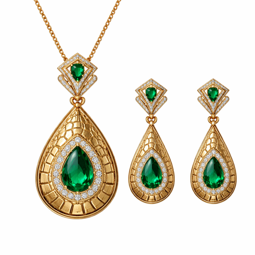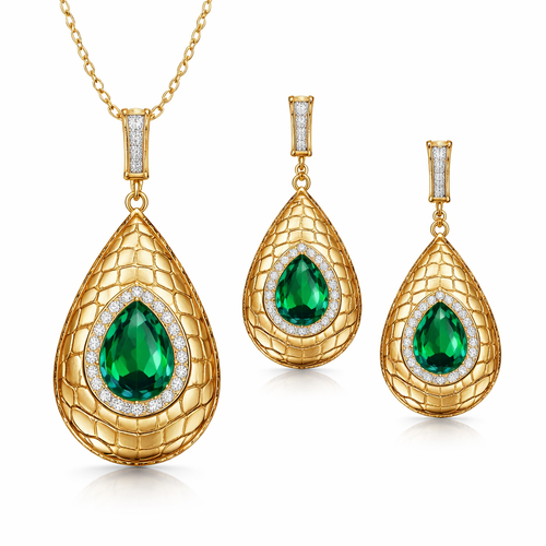 Create Pendant with earrings with crocodile style leather design with gemstones scattered, in gold